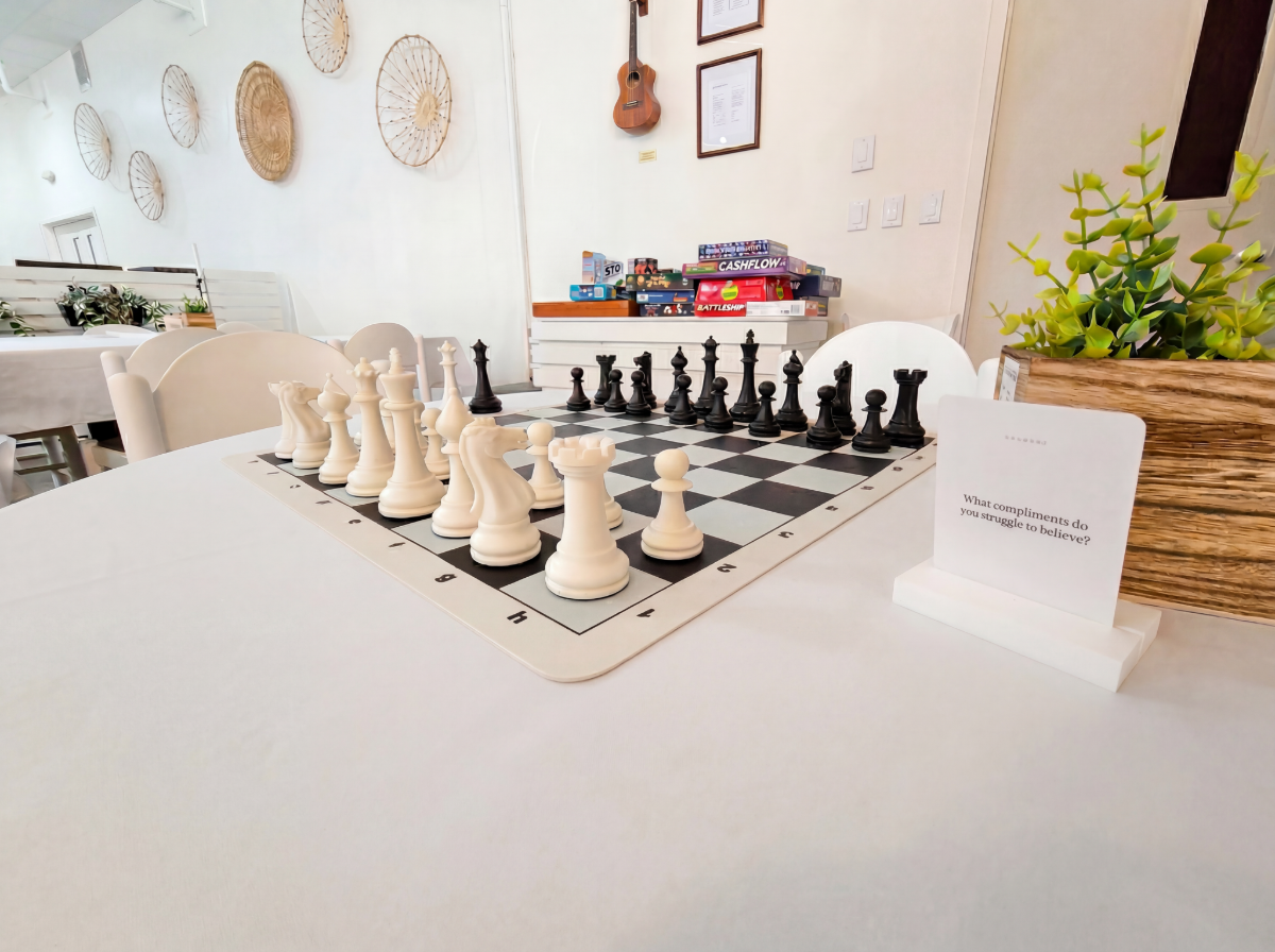 A shelf of board games that quietly encourages strangers to become friends. A "pick your own mug" experience that feels oddly grounding. Sofas that dare you to leave. A covered patio perfect for deep work or deeper conversation. A small stage — a signal that this is a space for expression, not just consumption.